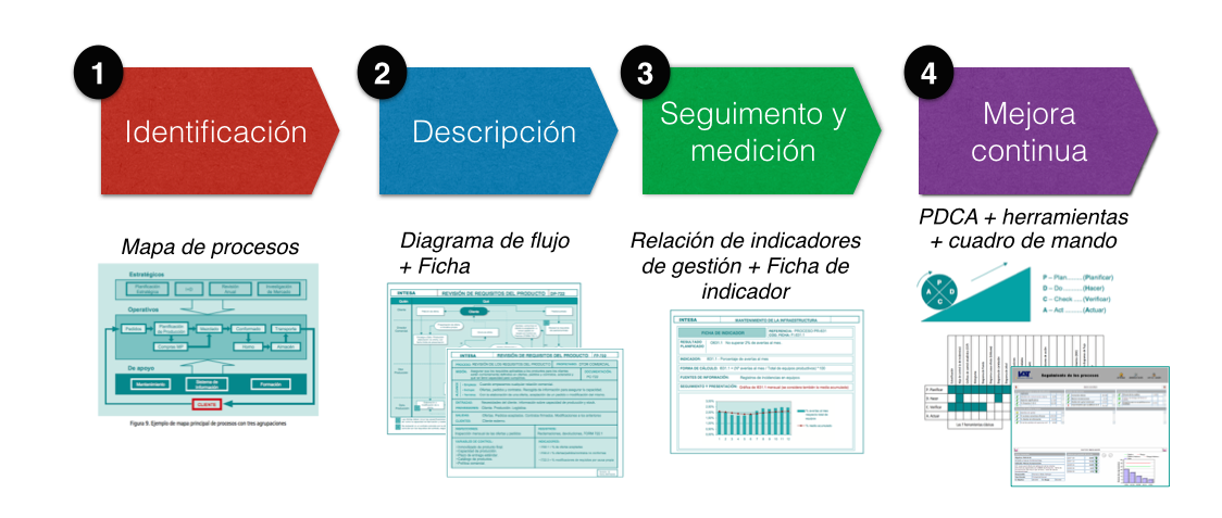Cuando una organización quiere dotar de un enfoque basado en procesos a su sistema de gestión, debe emprender un conjunto de actuaciones que se pueden agrupar en cuatro grandes pasos: